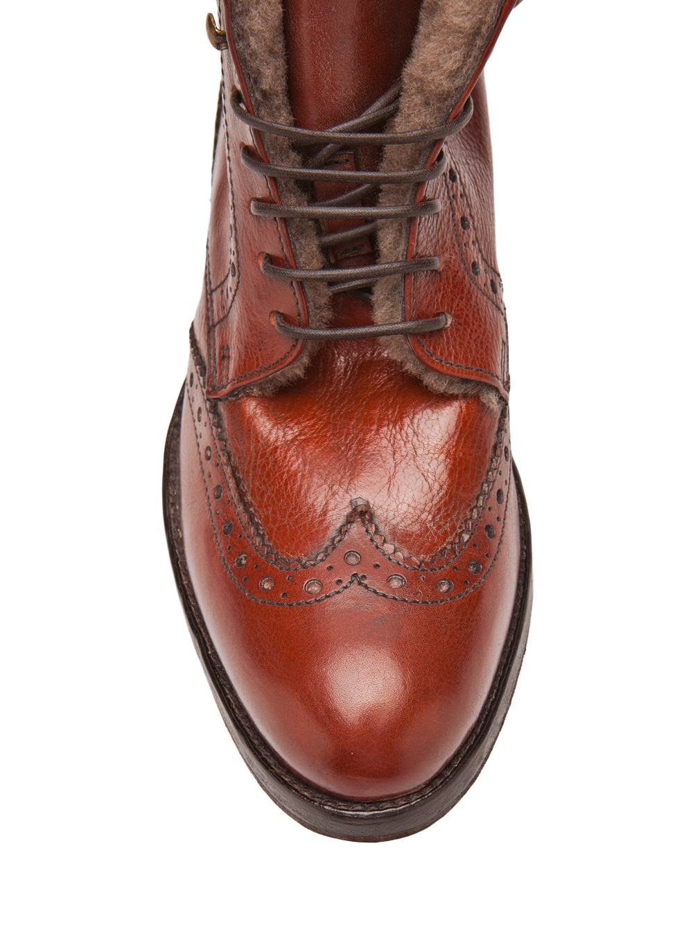 Genuine leather, genuine sheepskin lining. Thick sole insulates well. Laces.